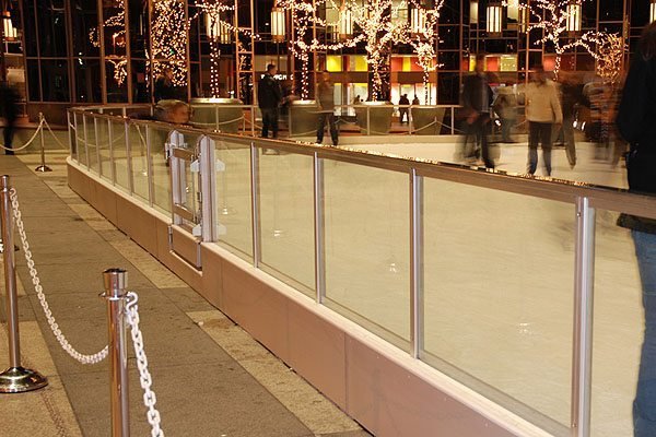 Glass rail system on outdoor rink at night